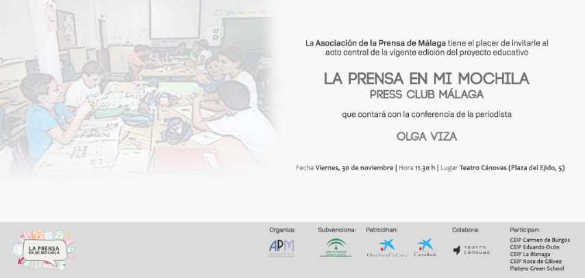 ‘La prensa en mi mochila’ tiene una segunda fase de carácter anual denominada Press Club Málaga. Son encuentros mensuales en los que la Asociación de la Prensa y el Colegio de Periodistas de Andalucía en Málaga invitan a la comunidad educativa de los centros escolares malagueños para que participen en un debate abierto sobre los futuros retos de los mass media y las redes sociales en el ámbito público y privado con periodistas de dentro y fuera de nuestras fronteras de diferentes medios de comunicación (radio, prensa, televisión, medios digitales) como Rosa Villacastín, Fernando Jáuregui y ahora Olga Viza.