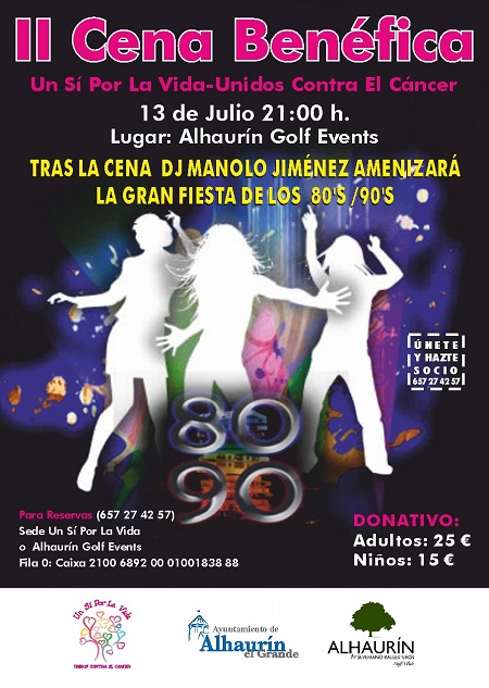 21:00 horas. Tras la cena dará comienzo una fiesta ambientada en la década de los 80`S y los 90`S y contará con el DJ Manolo Jiménez que pinchará grandes éxitos de la música de esas décadas. La recaudación irá destinada a continuar con la labor diaria de Un Sí Por La Vida, en beneficio de los pacientes de cáncer y sus familias.