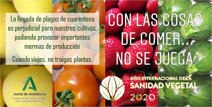 La Consejería de Agricultura, Ganadería, Pesca y Desarrollo Sostenible ha puesto en marcha la campaña de concienciación de la ciudadanía «Con las cosas de comer no se juega». Esta acción trata de alertar sobre el riesgo que supone para la agricultura andaluza la posibilidad de introducir o propagar plagas de cuarentena a través de vegetales, tanto plantas como frutas, que pueden ser portadoras de las mismas.