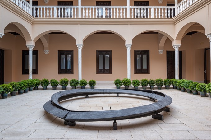 La obra Anillos de humo 2: Túneles concéntricos sesgados, no comunicantes, de 1980, preside el patio central del Museo Picasso Málaga.