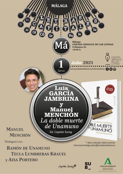 La Consejería de Cultura y Patrimonio Histórico, a través de la Agencia Andaluza de Instituciones Culturales, organiza mañana jueves día 1 en Málaga la presentación del nuevo ensayo de Manuel Menchón y Luis Jambrina, ‘La doble muerte de Unamuno’, publicada por la editorial Capitán Swing. El acto, que tendrá lugar en el Centro Andaluz de las Letras a las 19:30 horas, contará con la presencia de Manuel Menchón, Tecla Lumbreras Krauel, gestora cultural y Vicerrectora de la Universidad de Málaga, Aixa Portero, artista visual y profesora de la Universidad de Granada y Ramón de Unamuno, nieto de Miguel de Unamuno.