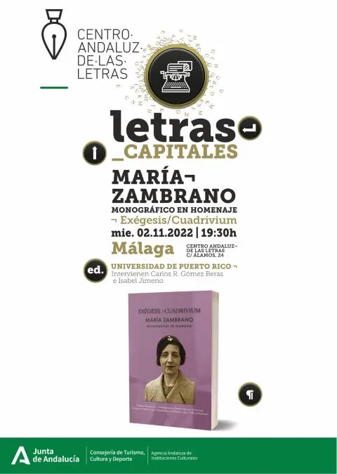 La Consejería de Turismo, Cultura y Deporte, a través de la Agencia Andaluza de Instituciones Culturales, arranca el próximo miércoles día 2 de noviembre la programación del ciclo ‘Letras Capitales’ con la presentación del monográfico en homenaje a María Zambrano de las revistas Exégesis/Cuadrivium de la Universidad de Puerto Rico. En el acto, que se celebrará a las 19:30 horas en el Centro Andaluz de las Letras, dialogarán el editor y catedrático Carlos R. Gómez Beras e Isabel Jimeno Benítez, autora encargada de la edición y selección de textos. La entrada es libre hasta completar aforo.
