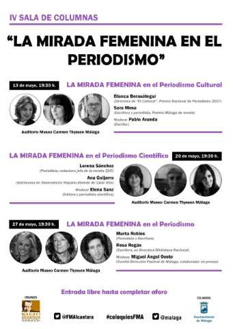 Viernes, 24 de mayo de 2019.- La periodista Marta Robles y la escritora Rosa Regás participarán este lunes en la mesa de debate ‘La mirada femenina en el periodismo’, que se celebrará a las 19.30 horas en el auditorio del Museo Carmen Thyssen Málaga y que estará moderada por el crítico de cine y televisión Miguel Ángel Oeste. Será el último encuentro del ciclo ‘Sala de Columnas’, organizado por la Fundación Manuel Alcántara en colaboración con el Ayuntamiento de Málaga.