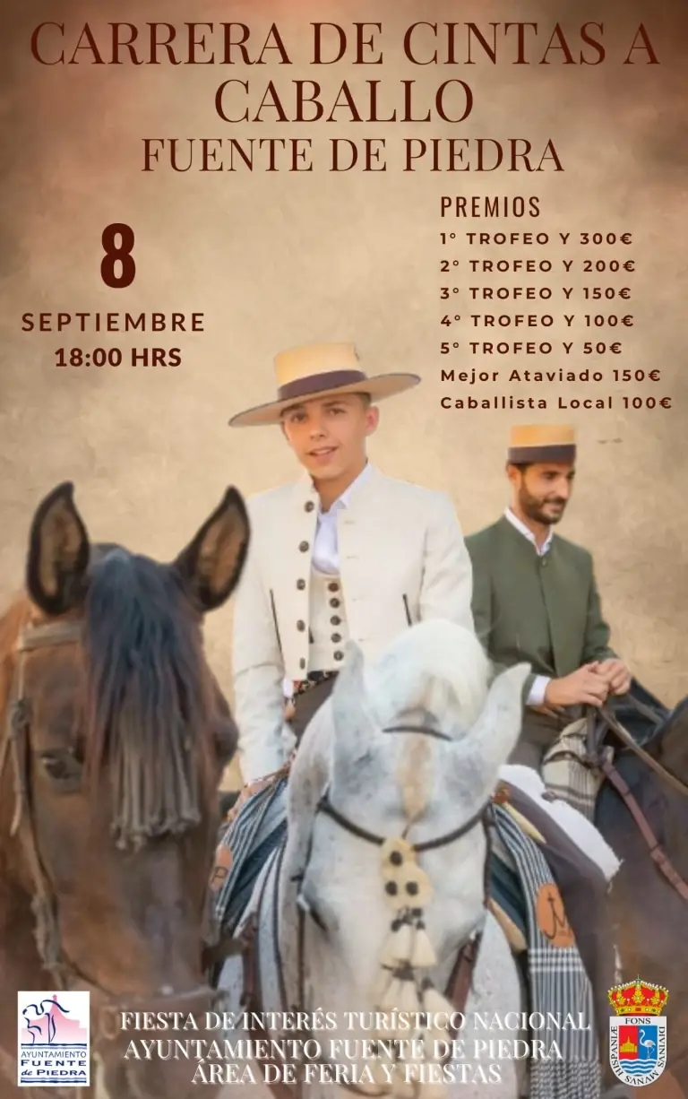 Por otra parte, el 8 de septiembre Fuente de Piedra acogerá la Carrera de Cintas a Caballo, inspirada en las ‘justas’, que es como se solventaban las discrepancias entre caballeros en el medievo; así como en los torneos medievales que se llevaban a cabo por motivos festivos como coronaciones, enlaces matrimoniales, victorias guerreras, con el objetivo de entretener, al mismo tiempo que los caballeros se ejercitaban en el manejo de las armas y se mantenían en forma para el día del asedio. El evento tendrá lugar en la calle Ancha a las 18:00 horas.