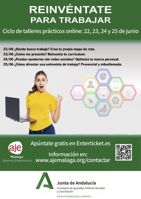 Posteriormente, el IAJ, junto la Asociación de Jóvenes Empresarios de Málaga (AJE Málaga) ofrece a partir del día 22 el ciclo de talleres ‘Reinvéntate para trabajar’, en el que en cuatro sesiones (días 22, 23, 24 y 25 de junio) ofrecerá respuestas a las preguntas ‘¿dónde busco trabajo?’, ‘¿cómo me presento?’, ‘¿Pueden ayudarme mis redes sociales?’ y ‘¿cómo afrontar una entrevista de trabajo?’. Inscripciones: Enterticket.es. Información: www.ajemalaga.org/contactar.