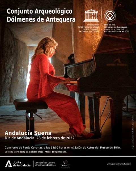 Por otra parte, en el Conjunto de los Dólmenes de Antequera tendrá lugar un concierto de piano a cargo de Paula Coronas, que hará un recorrido por distintas obras de temática andaluza, de la mano de autores como Albéniz, Falla, Turina, o Mitjana, entre otros. El concierto tendrá lugar a las 18 horas del 28 de febrero, con un aforo de 160 personas.