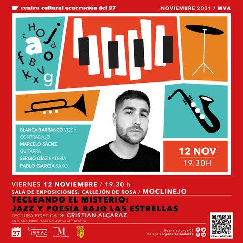 Mañana viernes, 12 de noviembre, se celebra una nueva cita de ‘Tecleando el misterio. Jazz y poesía bajo las estrellas’, el ciclo poético musical que organiza el Centro del 27 de la Diputación de Málaga y en el que las notas improvisadas de una banda de jazz se intercalan con los versos de un poeta. En esta ocasión, el invitado será el poeta malagueño Cristian Alcaraz, y el escenario, la sala de exposiciones Callejón de Rosa de Moclinejo, donde el autor estará acompañado por la banda de jazz formada por Pablo García al saxo, Marcelo Sánz a la guitarra, Sergio Díaz en la batería y Blanca Barranco como vocal y contrabajo.