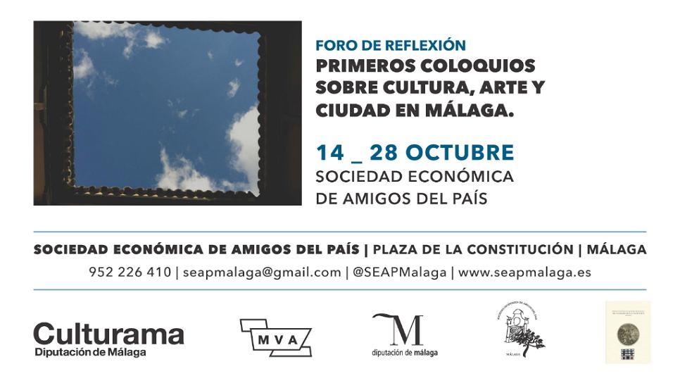 La Diputación de Málaga impulsa el I ‘Foro de Reflexión sobre cultura, arte y ciudad en Málaga’ de la Sociedad Económica de Amigos del País, en el que profesionales y expertos en mate ria cultural dialogarán sobre los principales desafíos, problemas y oportunidades que se presentan para Málaga. Se celebrará del 14 al 28 de octubre en el salón de actos de la SEAP (Plaza de la Constitución, 7).
