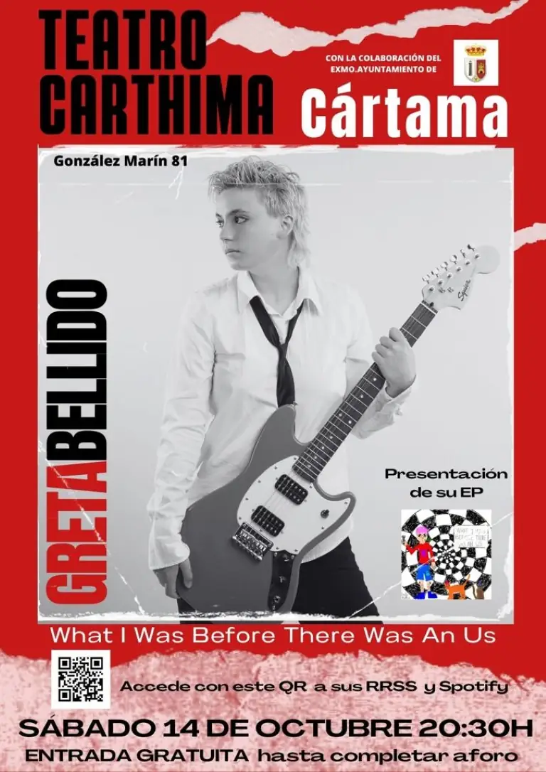 Mañana sábado, 14 de octubre, el Teatro Municipal Carthima acogerá un concierto de la artista y compositora cartameña Greta Bellido donde presentará su primer EP “What I was before there was an us”. El evento dará comienzo a las 20.30 horas, y la entrada es libre hasta completar el aforo.