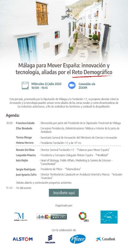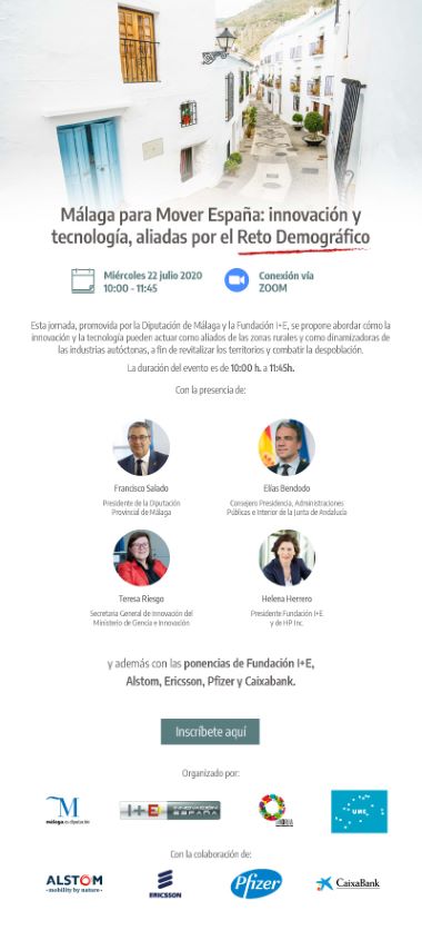 Bajo el lema ‘Málaga para Mover España: innovación y tecnología, aliadas por el Reto Demográfico’, esta cita, que se celebrará de forma virtual el miércoles 22 de julio y podrá seguirse a través de www.malaga.es/endirecto , abordará cuestiones tan diversas como la movilidad, la conectividad, la telemedicina y la inclusión financiera.