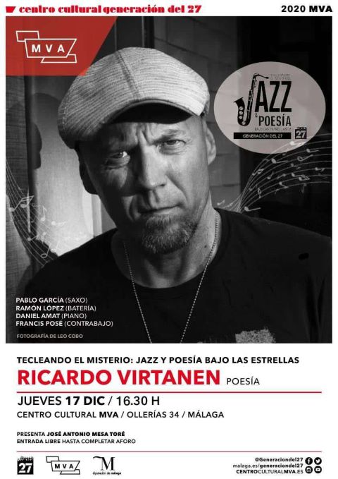 Este jueves, 17 de diciembre, el poeta Ricardo Virtanen protagonizará en el MVA una nueva cita del ciclo ‘Tecleando el misterio. Jazz y poesía bajo las estrellas’. El recital poético musical dará comienzo a las 16:30 horas y será de entrada libre hasta completar el aforo que ha sido reducido en cumplimiento de las medidas derivadas del Covid-19. Será retransmitido en directo a través del canal de Youtube del Centro del 27 .