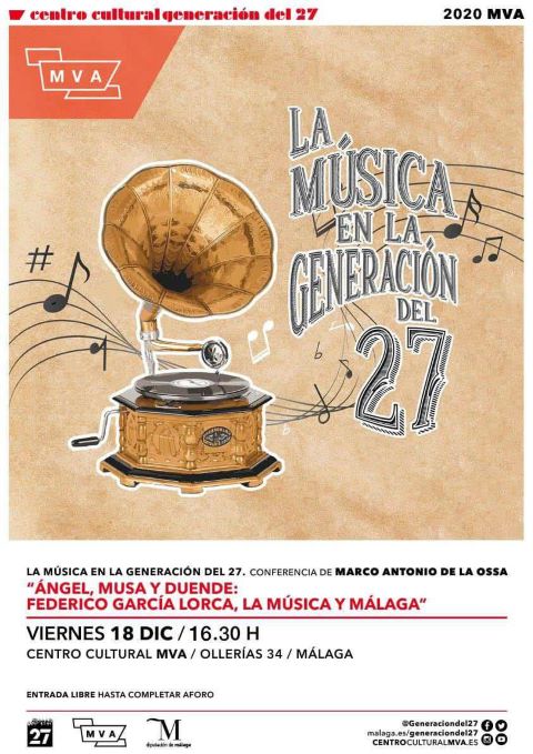 El ciclo ‘La música en la Generación del 27’ se encarga de analizar el notable papel que la cultura musical desempeñó en el grupo poético del 27. La cita del viernes, 18 de diciembre, a las 16:30 horas, acogerá la conferencia ‘Ángel, musa y duende: García Lorca, la música y Málaga’, a cargo de Marco Antonio de la Ossa. La entrada es libre hasta completar el aforo de la sala, que se ha reducido para cumplir las medidas de seguridad sanitaria, y el encuentro será retransmitido en directo a través del canal de Youtube del Centro del 27 .