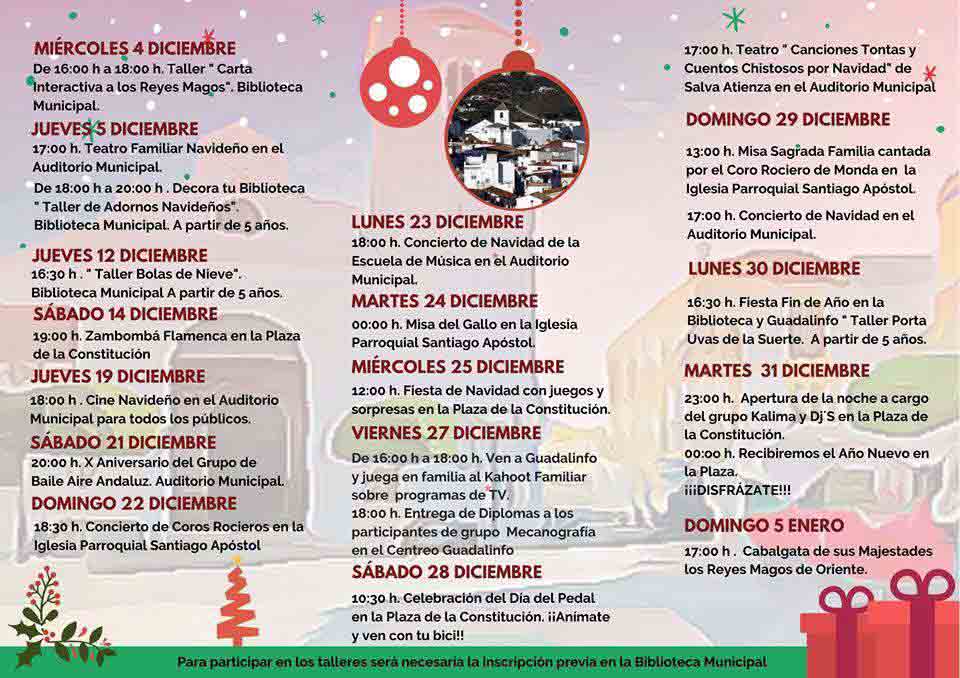 Cine, talleres de bolas de nieve, adornos navideños y portauvas y juegos infantiles completan el programa de actividades que se puede consular en la web municipal, www.monda.es, o en las redes sociales del Ayuntamiento de Monda.