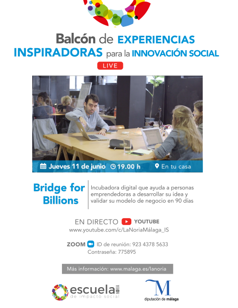 La Escuela de Impacto Social de La Noria de la Diputación de Málaga ofrece este mes de junio un nuevo espacio para la visibilización de experiencias de éxito de innovación social con el objetivo de inspirar al público. Bridge for Billions será la primera experiencia nacional e internacional que dará a conocerse el próximo jueves 11 y le seguirá la experiencia de éxito local Spiga Negra el jueves 25 de junio.