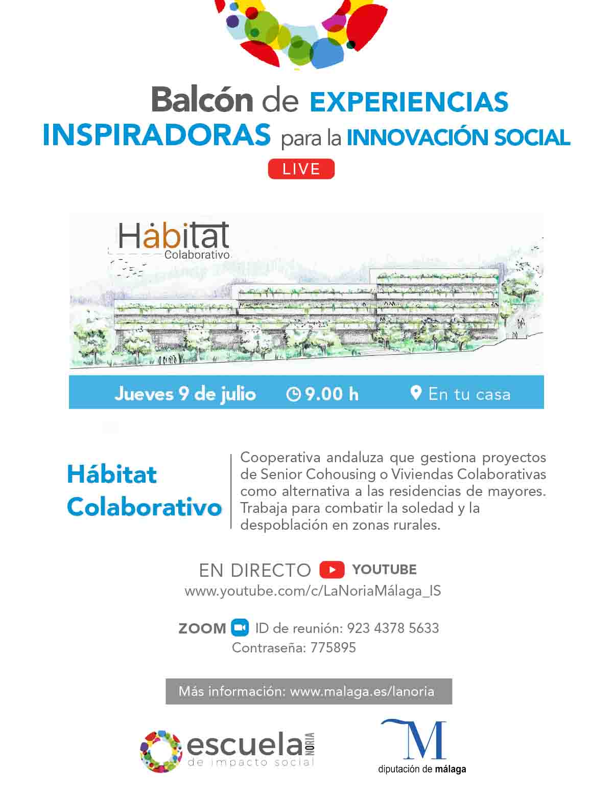 La ponencia, que correrá a cargo de José Carlos Rodrigo, presidente y socio fundador de Hábitat Colaborativo, cooperativa cordobesa con sede en Baena, se llevará a cabo de forma virtual y se podrá seguir en directo por el canal de Youtube de La Noria (www.youtube.com/c/LaNoriaMálaga_IS) y por ZOOM (ID 92343785633 y contraseña 775895) el jueves 9 de julio a las 9:00 horas.