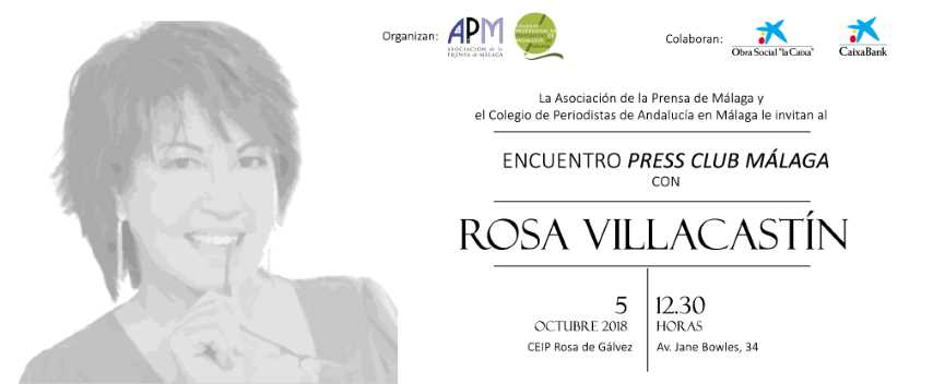 MÁLAGA 03/10/2018. Este viernes, 5 de octubre, Rosa Villacastín inaugurará el nuevo ciclo de conferencias Press Club Málaga, organizado por la Asociación de la Prensa de Málaga y la demarcación territorial del Colegio de Periodistas de Andalucía en la provincia, y que cuenta con el apoyo de CaixaBank y la Obra Social “la Caixa”. El evento, de entrada libre hasta completar aforo, tendrá lugar a las 12.30 horas en el colegio público Rosa de Gálvez de Ciudad Jardín.