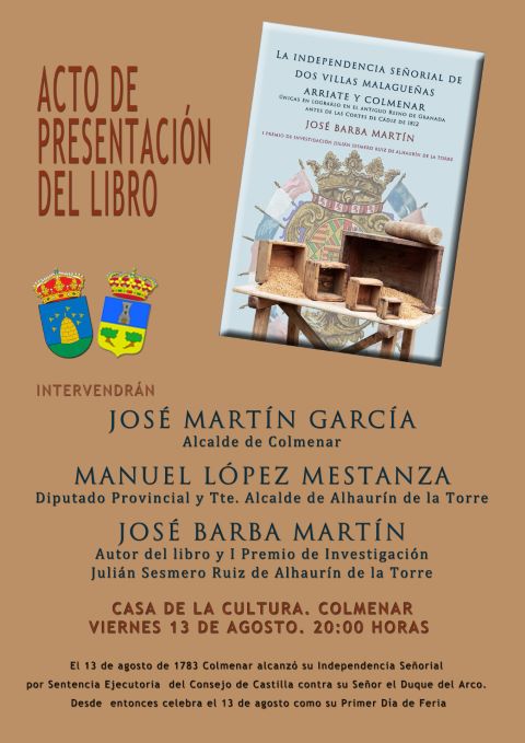 La fecha elegida para la celebración de este acto coincide con el primer día oficial de la Feria de Colmenar, pues precisamente un 13 de agosto, en este caso, de 1783, esta localidad alcanzó su independencia por Sentencia Ejecutoria del Consejo de Castilla contra su Señor el Duque del Arco. Precisamente, ese es el eje principal del libro de Barba, pues su investigación de 2016, por la que obtuvo la máxima calificación del jurado, analiza los casos de ambos pueblos de la provincia de Málaga que procedían de señorío y luchaban por su independencia, y también menciona a otros que no lo lograron, como el caso de Montecorto. Se da la circunstancia de que Colmenar era un territorio perteneciente a los Lasso de Vega, los mismos señores que en Alhaurín de la Torre tenían muchas propiedades, como Huerta Alta o Huerta Palacio, además de poseer la Casa del Conde.