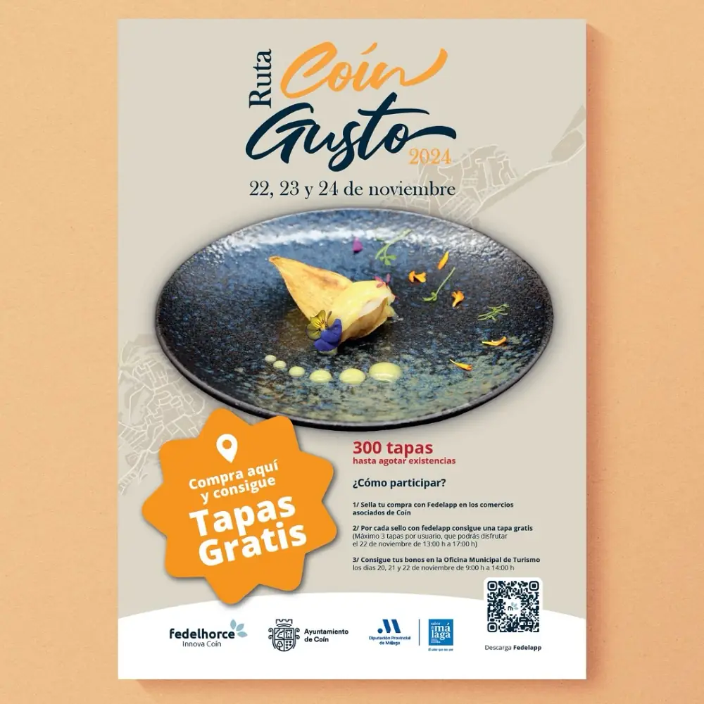 Además, los vecinos y visitantes que realicen sus compras en los comercios locales en los días previos al evento podrán optar conseguir tapas gratis. Para ello, cada cliente puede sellar una compra diaria y recoger sus cupones del 20 al 22 de noviembre por la mañana en la Oficina Municipal de Turismo, antiguo Ayuntamiento de Coín. Las tres tapas gratis conseguidas podrán ser disfrutadas el primer día de la ruta de 13:00 a 17:00 horas.