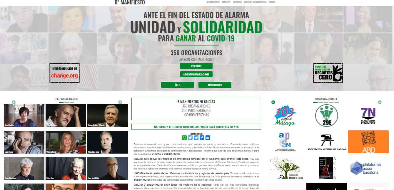 Tras más de 90 días de Estado de Alarma son ya más de 350 las organizaciones que se han unido en el manifiesto “Unidad y solidaridad para ganar al COVID-19”. Con el respaldo de 200 personalidades y más de 30 mil ciudadanos, el manifiesto se ha publicado hasta en SEIS ocasiones en la prensa digital.