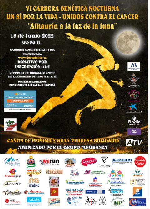 La Asociación Un Sí Por La Vida celebrará  la VI carrera nocturna “A la luz de la Luna”, el próximo sábado 18 de junio a las 22:00 h, en Alhaurín el Grande.  Dentro del calendario oficial de pruebas, la carrera, de una duración aproximada de 90 minutos,  está organizada por la Federación Andaluza de Atletismo. La gestión ha sido cedida a la asociación  Un Sí Por La Vida – Unidos Contra el Cáncer y su recaudación irá destinada a financiar los tratamientos de los pacientes de cáncer.