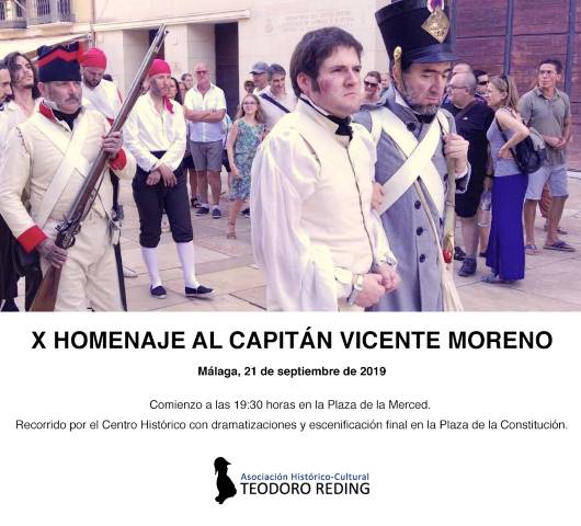 Homenaje que, desde 2010, la Asociación Histórico – Cultural «Teodoro Reding» realiza todos los años en memoria del capitán Vicente Moreno (Antequera, 1773 – Granada,1810), héroe malagueño frente a las tropas napoleónicas, que fuera oficial del Regimiento de Infantería de Línea de Málaga y, tras la ocupación del Sur peninsular, jefe de unas de las más importantes partidas guerrilleras de la provincia. Se puede leer un breve artículo biográfico del personaje de mano del presidente de la asociación, Jon Valera Muñoz de Toro, que ha interpretado al capitán durante estos 10 años, en este enlace ->> https://teodororeding.es/2010/08/18/vicente-moreno-baptista/