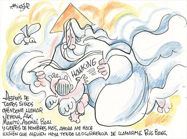 D : Lo de Adán y Eva vamos a dejarlo a los teólogos y exégetas. No hay que tomarse estas cosas al pie de la letra. Yo digo verdades y otros les dan forma literaria, de cuentecillo. Y no veas la de chistes sobre esto. El que me hizo más gracia y me lo contó uno que está aquí, no recuerdo si era Eugenio, Mingote, Pepe da Rosa…¿ A qué no sabes el origen del ombligo de Adán? Pues porque  él le pidió una compañera y Dios le dijo: ¡ anda, pillín!, con el dedo en la barriga y, claro, como el barro estaba todavía blando…¡Ja,ja,ja…!