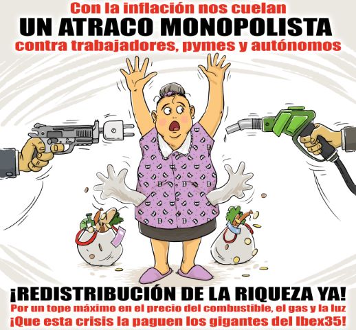 (Eduardo Madroñal Pedraza) Redistribuir la riqueza es poner los enormes recursos de los que dispone la economía española al servicio de los intereses del país y de las necesidades de la gente. Al contrario de lo que ocurre en la actualidad, en el que esos recursos son utilizados por una minoría de bancos y monopolios -nacionales y extranjeros- para enriquecerse a costa de saquear al pueblo y esquilmar al país. El objetivo principal de una política de redistribución de la riqueza es la única manera de resolver de forma estructural y permanente las necesidades de la mayoría, expropiar un poco a los expropiadores.