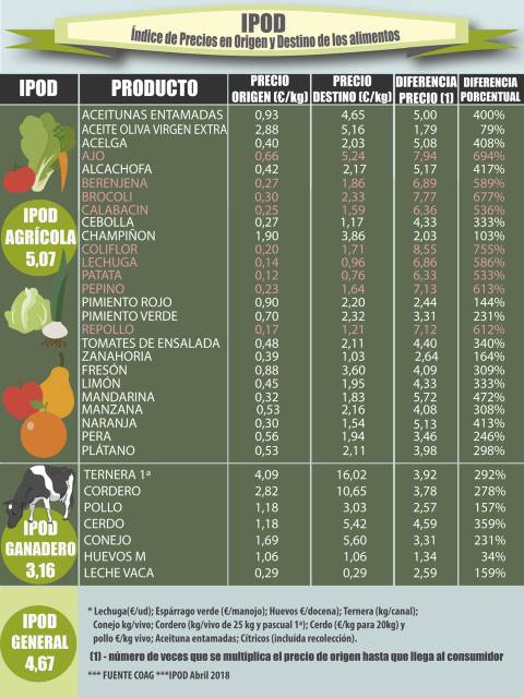 El IPOD es un índice elaborado mensualmente. Hemos utilizado el de abril de 2018 para dar algo de perspectiva temporal al persistente abismo entre los precios en origen de los alimentos y los de venta al consumidor. Porque no es algo de los últimos meses, es una constante que viene desde hace bastantes años. Y la diferencia abismal se mantiene aproximadamente en los mismos valores, con pequeñas fluctuaciones. Por ejemplo, el último índice, el de diciembre de 2019, retrata el mismo saqueo doble. El IPOD General se multiplica por 4,45 (abril 2018: 4,67). El IPOD Agrícola por 4,83 veces (abril 2018: 5,07). Y el IPOD Ganadero por 3,05 (abril 2018: 3,16).
