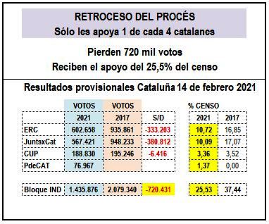 (Eduardo Madroñal Pedraza) Las fuerzas que apoyan el procés, y sus élites, han sufrido un nuevo retroceso, han perdido votos, muchos votos y, de nuevo, han perdido apoyo social, y, por tanto, hoy están más débiles. Esto no es una “opinión”, son hechos contundentes. Es la verdad que muestran los datos.