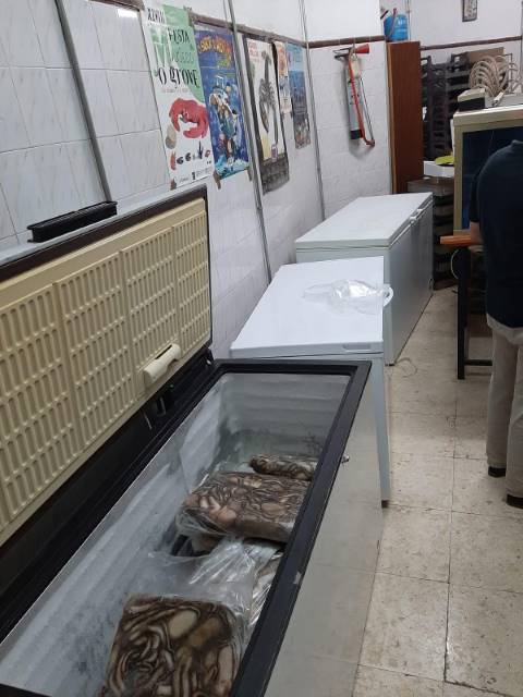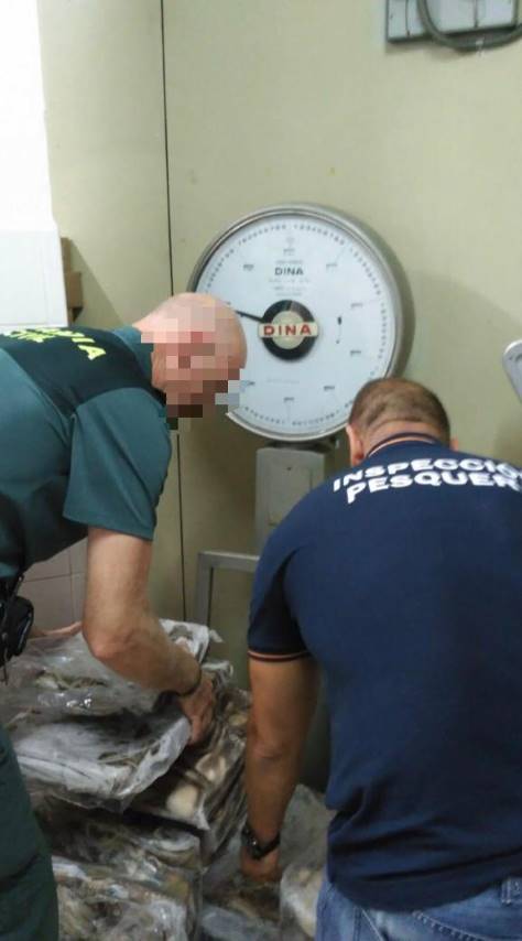 En el local, que aparentaba ser una cochera particular, se hallaron varios arcones de congelación, que contenían un total de 405 kilos de pulpo. Toda la mercancía carecía de etiquetado así como de documentación que acreditara su origen.