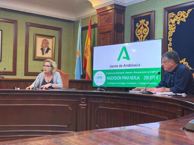 La delegada territorial de Empleo, Formación, Trabajo Autónomo, Economía, Conocimiento, Empresas y Universidad de la Junta de Andalucía en Málaga, Carmen Sánchez Sierra, ha presentado en el municipio de Nerja la nueva medida extraordinaria que ha puesto en marcha la Consejería de Empleo, Formación y Trabajo Autónomo, para la Activación, Impulso y Recuperación del Empleo (AIRE) de los municipios andaluces y malagueños, una actuación “destinada a reactivar el empleo y a beneficiar a la población desempleada, paliando así, los efectos ocasionados por la crisis sanitaria provocados por el COVID_19” según ha explicado Sánchez Sierra que ha estado acompañada por el aclade del municipio de Nerja, Jose Alberto Armijo.