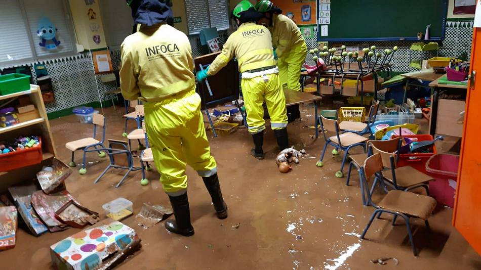 Responsables del la Delegación Territorial coordinan las operaciones de limpieza de los centros afectados La Junta de Andalucía trabaja intensamente para conseguir normalizar la situación en los centros escolares afectados por las inundaciones del pasado sábado en la barriada malagueña de Campanillas, con el objeto de que puedan abrir sus puertas en el plazo más breve posible.