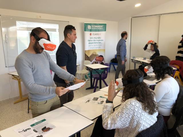 Los especialistas de la Consultora ‘Techmakers’, proveedora del material técnico que fabrica la multinacional británica ‘CLASSVR’ y partner nacional de la división educativa del gigante Microsoft, son los encargados de implementar el programa de formación en el que los docentes de El Pinar ya han completado las primeras sesiones con unos resultados más que satisfactorios. “Estamos hablando de un recurso potente que añade un enfoque más rico, práctico y profundo a las dinámicas de clase y eso se nota en la respuesta de los profesores. Se acercan con curiosidad, interés y sorpresa. A medida que vamos avanzando en los detalles, surgen preguntas, inquietudes e ideas concretas para aplicarlo en su trabajo”, explica José Antonio García, responsable de Formación de ‘Techmakers’, quien también concretaba que apenas una decena de centros de la geografía nacional y en torno a cinco en la comunidad andaluza cuentan en estos momentos con un recurso tecnológico de Realidad Virtual como el ‘CLASSVR’ por el que ha apostado El Pinar, un hecho que vuelve a situar a la institución académica alhaurina a la vanguardia de la innovación didáctica en clave tecnológica.