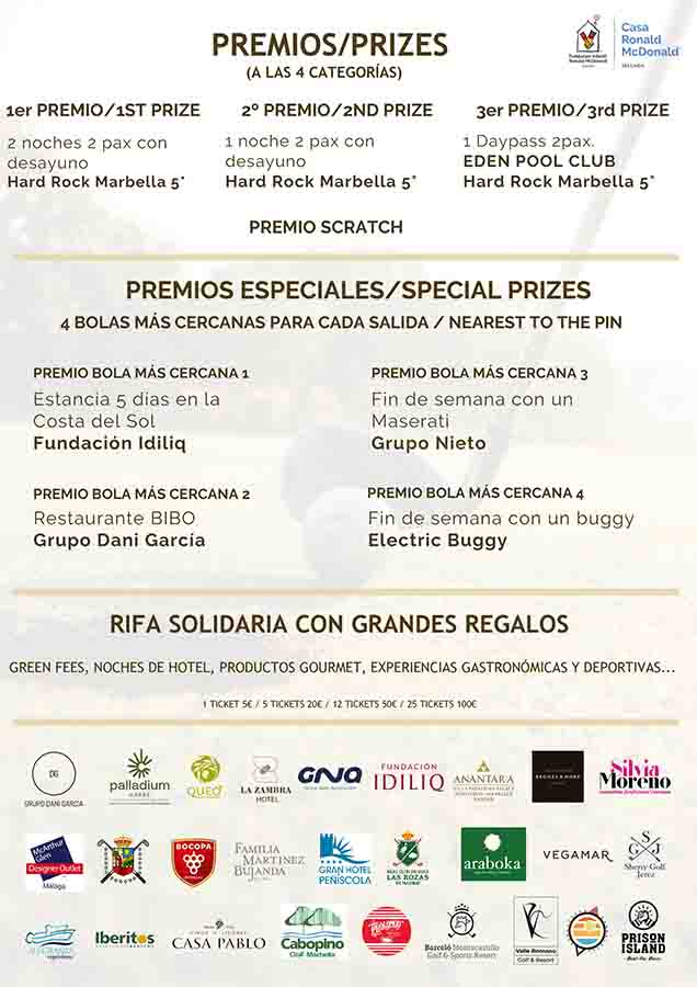Además, los jugadores podrán participar en una estupenda rifa solidaria con increíbles regalos (noches de hotel, green fees, experiencias gastronómicas…), gracias a empresas amigas como, Silvia Moreno Beauty, Fundación Idiliq y METT 5* Hotel & Beach Resort Marbella-Estepona, entre muchos otros.