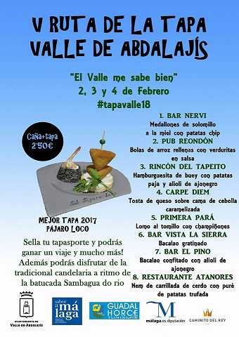 El municipio del Valle Abdalajís celebra del 2 al 4 de febrero la V edición de su Ruta de la Tapa. Un evento que contará con la participación de 8 establecimientos de hostelería, que ofrecerán tapas y bebida a un precio de 2,50 euros, el viernes y sábado de 13:00 a 17:30 y de 19:00 a 23:00 horas, y el domingo hasta las 17:00 horas.