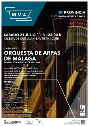 El sábado, 21 de julio, Coín tiene otra cita musical; esta vez, en la Iglesia San Juan Bautista del municipio, un escenario de belleza y acústica inmejorables que recibirá a una formación única no solo en la provincia, sino en todo el país: la Orquesta de Arpas de Málaga, formada por diez arpas de diferentes épocas y estilos.