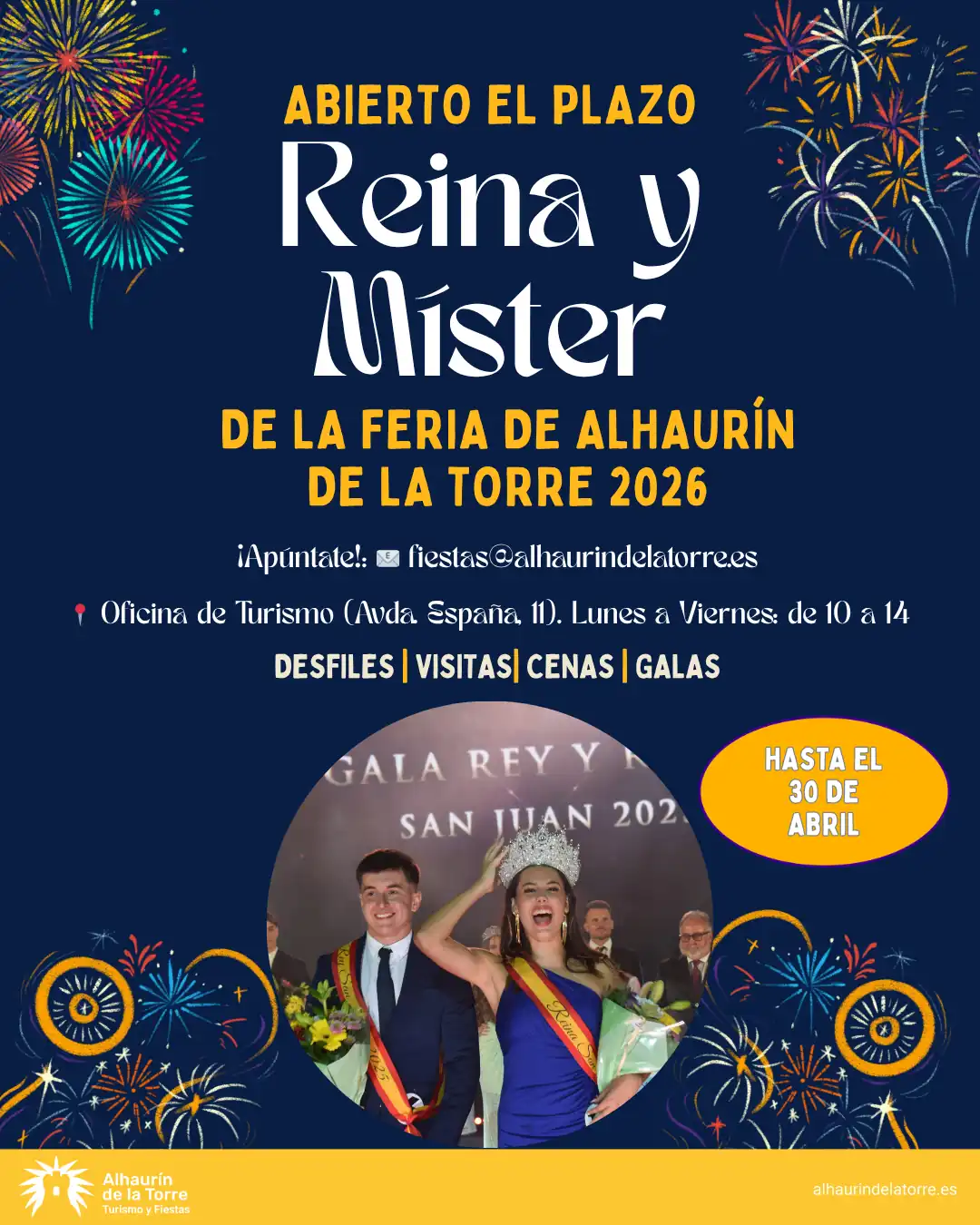 El plazo de inscripción permanecerá abierto hasta el 30 de abril, y podrá realizarse a través del correo electrónico fiestas@alhaurindelatorre.es o de manera presencial en la Oficina de Turismo, situada en la Avenida de España, en horario de lunes a viernes, de 10:00 a 14:00 horas.