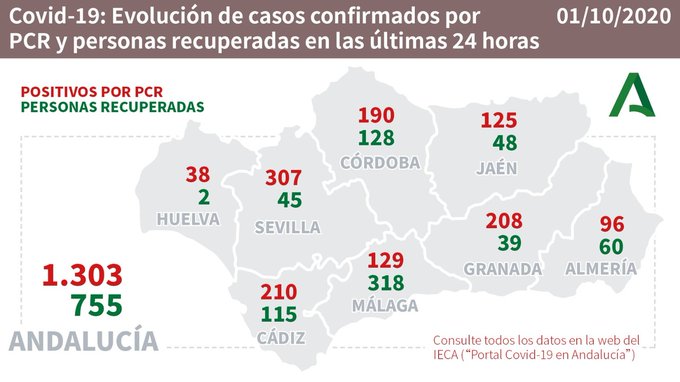 Por provincias: en Almería (44 hospitalizaciones, de los que 13 en UCI), Cádiz (123 hospitalizaciones, de los que 26 en UCI), Córdoba (133 hospitalizaciones, de los que 18 en UCI), Granada (105 hospitalizaciones, de los que 12 en UCI), Huelva (19 hospitalizaciones, de los que ninguno en UCI), Jaén (82 hospitalizaciones, de los que 11 en UCI), Málaga (191 hospitalizaciones, de los que 30 en UCI) y Sevilla (346 hospitalizaciones, de los que 44 en UCI).