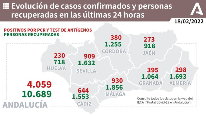 Por provincias: en Almería (86 hospitalizaciones, de las que 8 en UCI), Cádiz (141 hospitalizaciones, de las que 14 en UCI), Córdoba (119 hospitalizaciones, de las que 17 en UCI),   Granada   (179   hospitalizaciones,   de   las   que   22   en   UCI),   Huelva   (56 hospitalizaciones, de las que 6 en UCI), Jaén (128 hospitalizaciones, de las que 17 en UCI),   Málaga   (227   hospitalizaciones,   de   las   que   23   en   UCI)   y   Sevilla   (205 hospitalizaciones, de las que 31 en UCI).