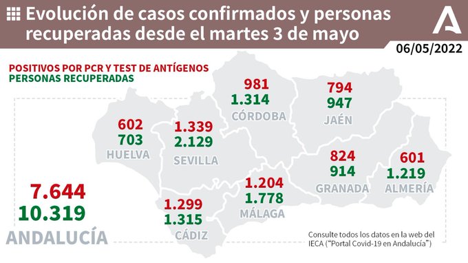 Por provincias: en Almería (60 hospitalizaciones, de las que 2 en UCI), Cádiz (98 hospitalizaciones, de las que 9 en UCI), Córdoba (68 hospitalizaciones, de las que 5 en UCI), Granada (70 hospitalizaciones, de las que 5 en UCI), Huelva (55 hospitalizaciones, de las que 2 en UCI), Jaén (65 hospitalizaciones, de las que 4 en UCI), Málaga (140 hospitalizaciones, de las que 9 en UCI) y Sevilla (209 hospitalizaciones, de las que 10 en UCI).