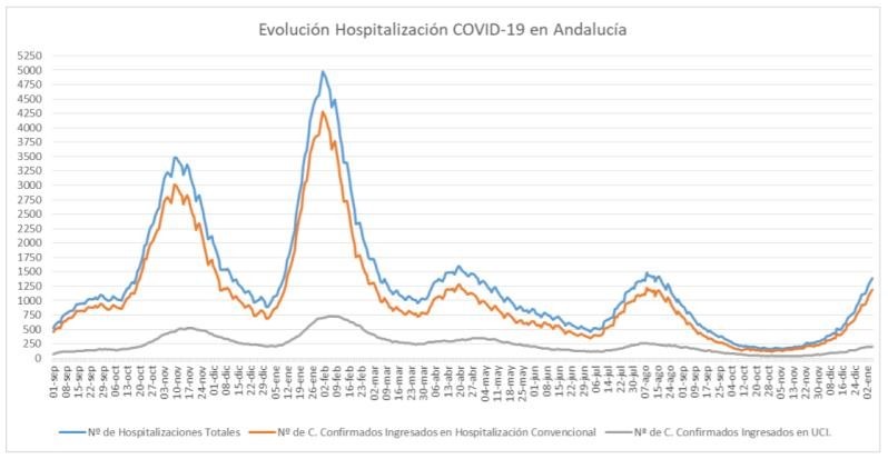 La Consejería de Salud y Familias informa de que, actualmente, 1.489 pacientes confirmados con COVID-19 permanecen ingresados en los hospitales andaluces, de los que 222 se encuentran en UCI.