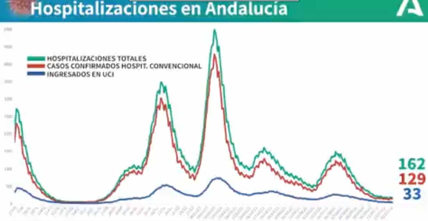 La Consejería de Salud y Familias informa de que, actualmente, 162 pacientes confirmados con COVID-19 permanecen ingresados en los hospitales andaluces, de los que 33 se encuentran en UCI.