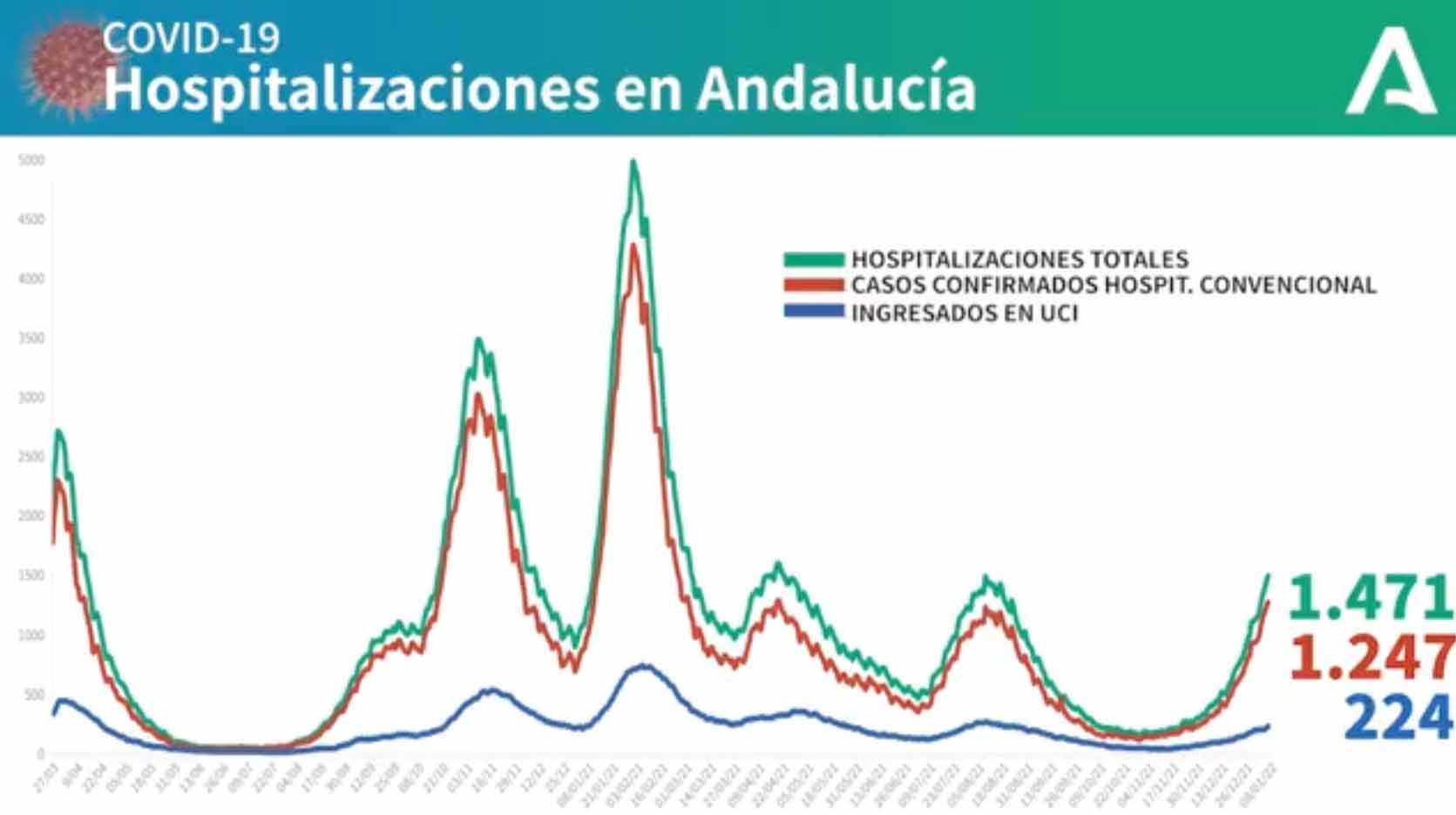 La Consejería de Salud y Familias informa de que, actualmente, 1.471 pacientes confirmados con COVID-19 permanecen ingresados en los hospitales andaluces, de los que 224 se encuentran en UCI.