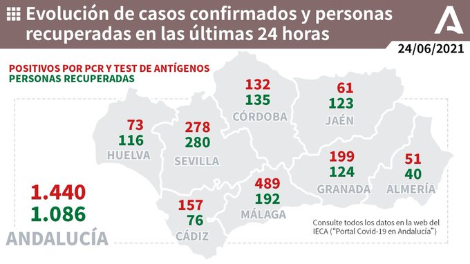 Por provincias: en Almería (20 hospitalizaciones, de las que 6 en UCI), Cádiz (55 hospitalizaciones, de las que 7 en UCI), Córdoba (84 hospitalizaciones, de las que 23 en UCI), Granada (52 hospitalizaciones, de las que 18 en UCI), Huelva (38 hospitalizaciones, de las que 6 en UCI), Jaén (76 hospitalizaciones, de las que 18 en UCI), Málaga (91 hospitalizaciones, de las que 11 en UCI) y Sevilla (152 hospitalizaciones, de las que 43 en UCI).