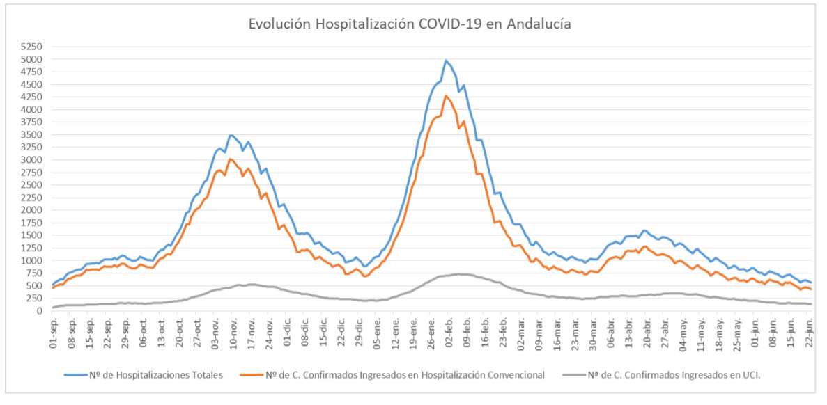 La Consejería de Salud y Familias informa de que, actualmente, 568 pacientes confirmados con COVID-19 permanecen ingresados en los hospitales andaluces, de los que 132 se encuentran en UCI.