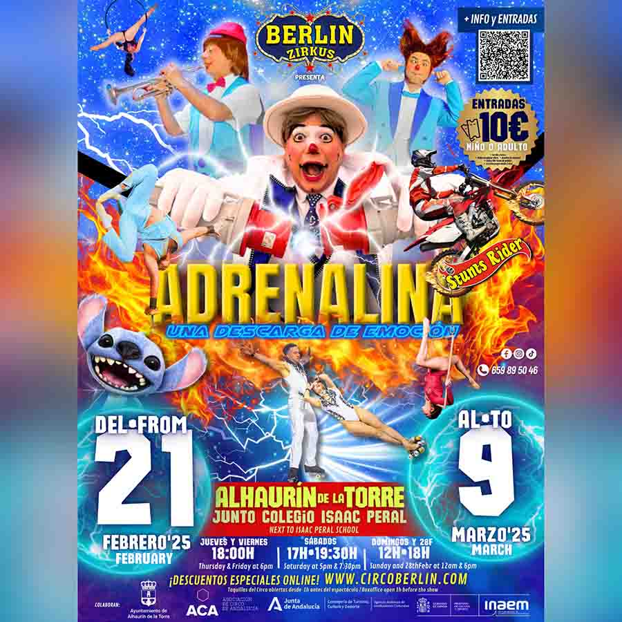 El Berlín Zirkus aterriza en Alhaurín de la Torre con su producción más impactante hasta la fecha: «ADRENALINA», un espectáculo diseñado para dejar sin aliento a espectadores de todas las edades. La cita será junto al CEIP Isaac Peral, del 21 de febrero al 9 de marzo, ofreciendo una experiencia cargada de emoción, humor y asombrosas acrobacias.