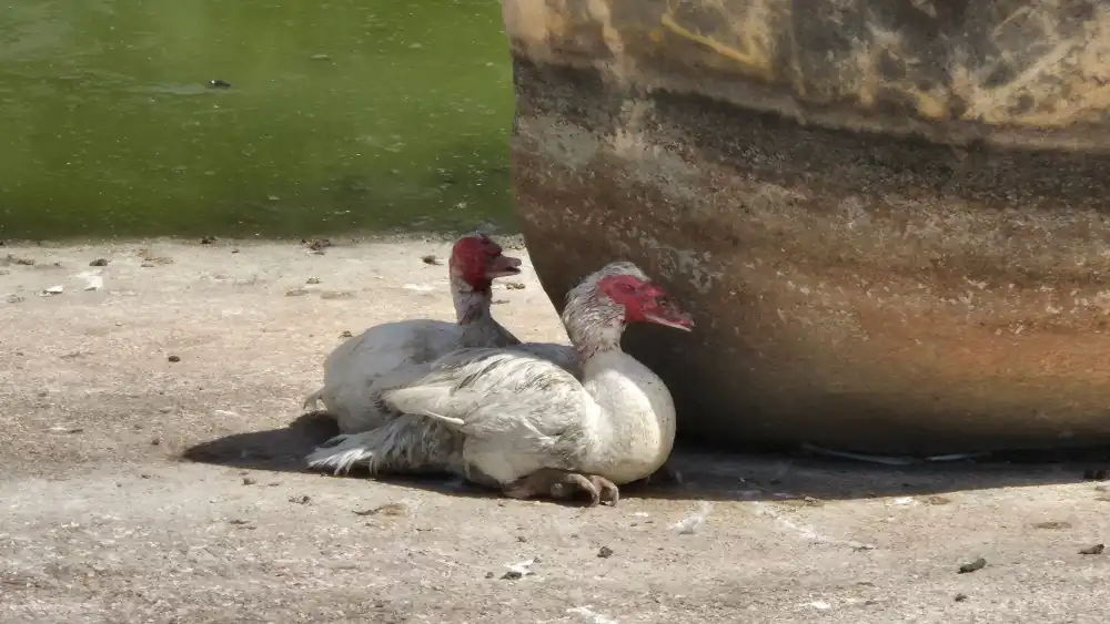 • Fotos: PACMA / patos huyendo del sol / bidones habilitados / estanque semivacío.