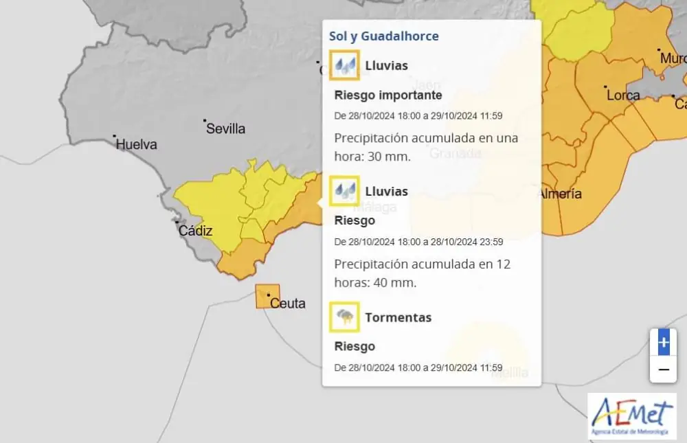 La Agencia Estatal de Meteorología (AEMET) ha activado una alerta de nivel amarillo por tormentas en las comarcas de Sol y Guadalhorce. Este aviso implica la posibilidad de daños moderados tanto a personas como a bienes, especialmente para aquellos en zonas vulnerables o expuestas.