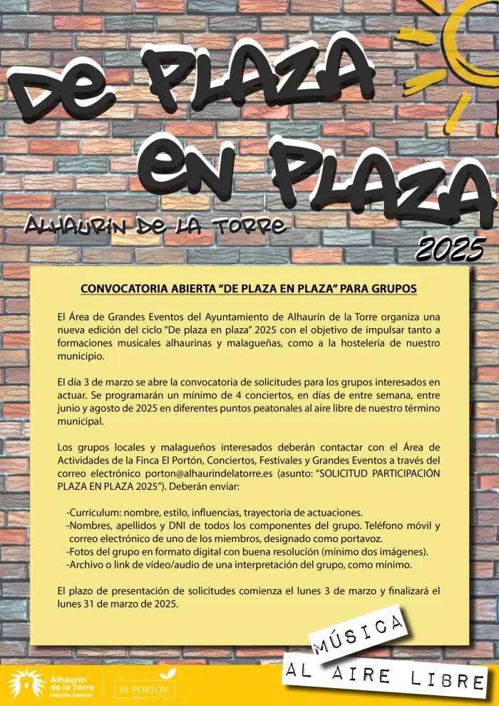 La convocatoria para las solicitudes de los grupos que estén interesados en formar parte de ‘De plaza en plaza’ se ha abierto ya y estará vigente hasta el día 31 de marzo. Para ello todos los que lo deseen pueden escribir un correo a porton@alhaurindelatorre.es con el asunto ‘Solicitud participación De plaza en plaza 2025’ que incluya un currículum del grupo o solista con el nombre, estilo, influencias y trayectoria de actuaciones.