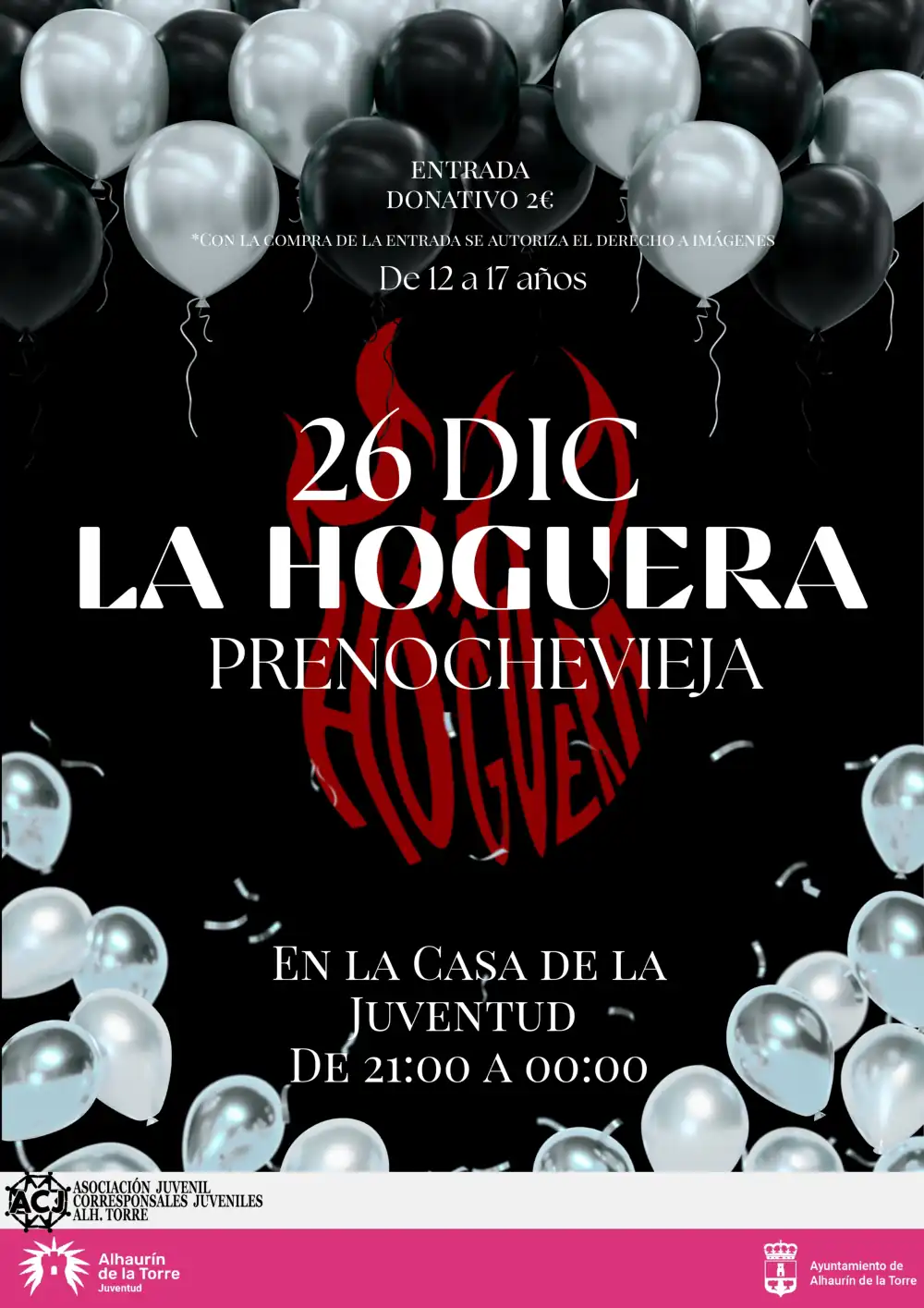 El Ayuntamiento de Alhaurín de la Torre ha organizado para el próximo 26 de diciembre una fiesta de Prenochevieja dirigida a jóvenes de entre 12 y 17 años, que se celebrará en la Casa de la Juventud entre las 21:00 y las 00:00 horas. La iniciativa, denominada La Hoguera, está impulsada por el Área de Juventud, que dirige Iraya Villalba, en colaboración con la Asociación Corresponsales Juveniles.